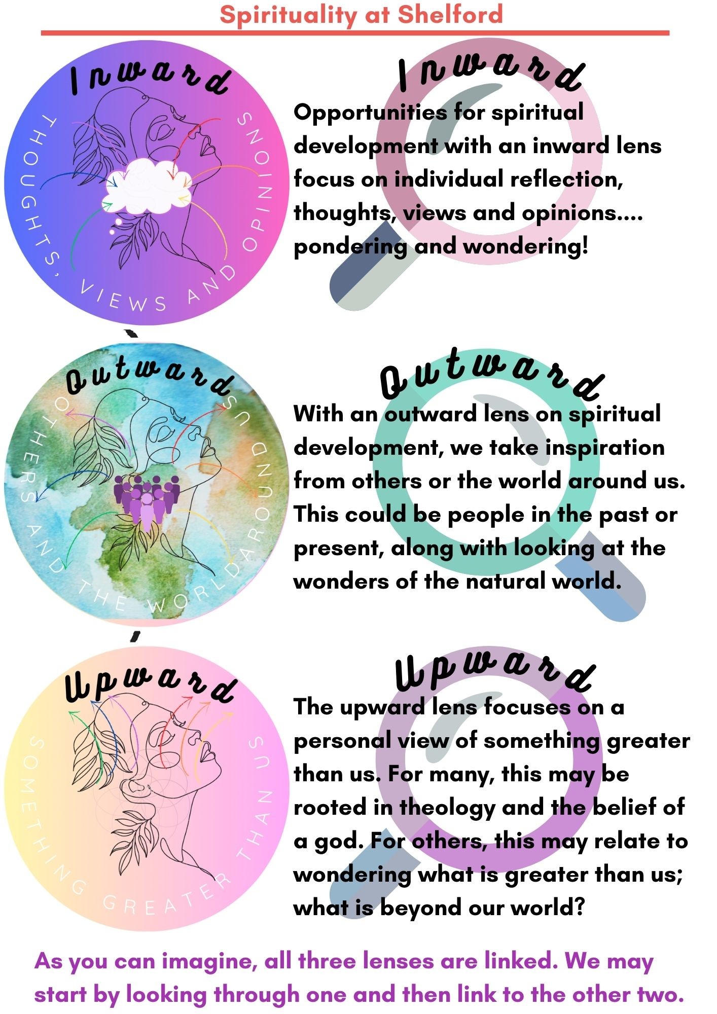 Spirituality sits separately to faith or religion and it is part of pupil and adults’ personal development. To help pupils and adults understand spiritual development, we use the phrases: inward; outward; upward. A summary of what these mean is below.